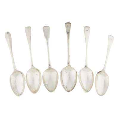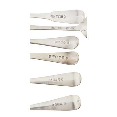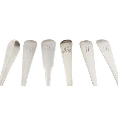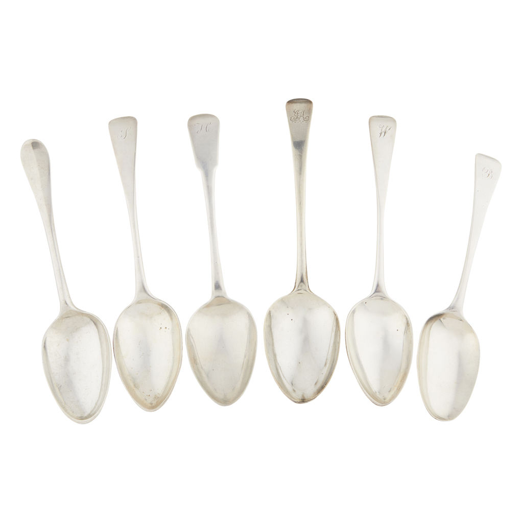 italic AJ/E to reverse of terminal; together with a pair of tablespoons, R. G., Edinburgh 1802, of Old English pattern, engraved W to terminal; another pair, J.McKay, Edinburgh 1811, of Fiddle pattern; another pair, William Fearn, London 1790, of Old English pattern, engraved initial to terminal and a pair of Newcastle tablespoons, GM (13)