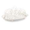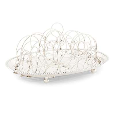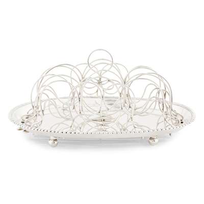 the bold rounded rectangular base with gadroon edge, with seven divisions formed from simple looped wire, the central division with carry handle, the base engraved with a crest of an egg timer and motto 'In time', all raised of four ball feet