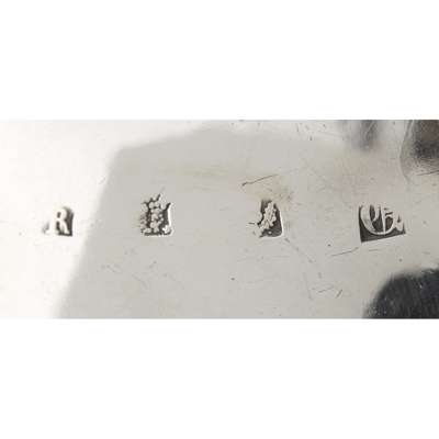 of traditional form, gadroon border, leaf clasped S-scroll handle, raised on three scalloped feet with stepped legs, crest of an oak tree with motto SUB TEGMINE to body
