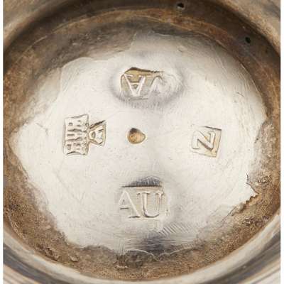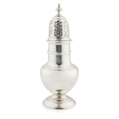 Assay Master Archibald Ure, the large baluster body with reeded girdle and spreading circular foot, the domed pull-off cover with alternating pierced panels and urn finial, engraved initial 'N' to underside