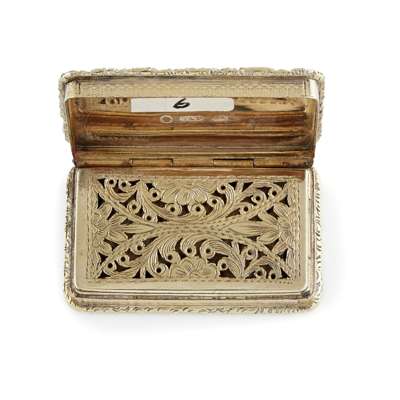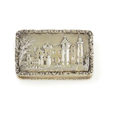 silver gilt, the hinged cover with a view of Abbotsford, well cast foliate border, good pierced and engraved grill