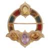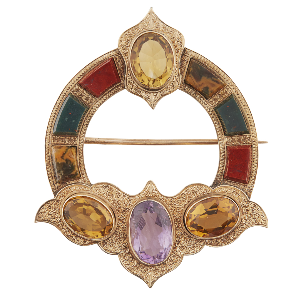 of lobed circular outline, collet set with four oval shaped citrines and a central oval shaped amethyst, the border set with varying agates, presented in a fitted box