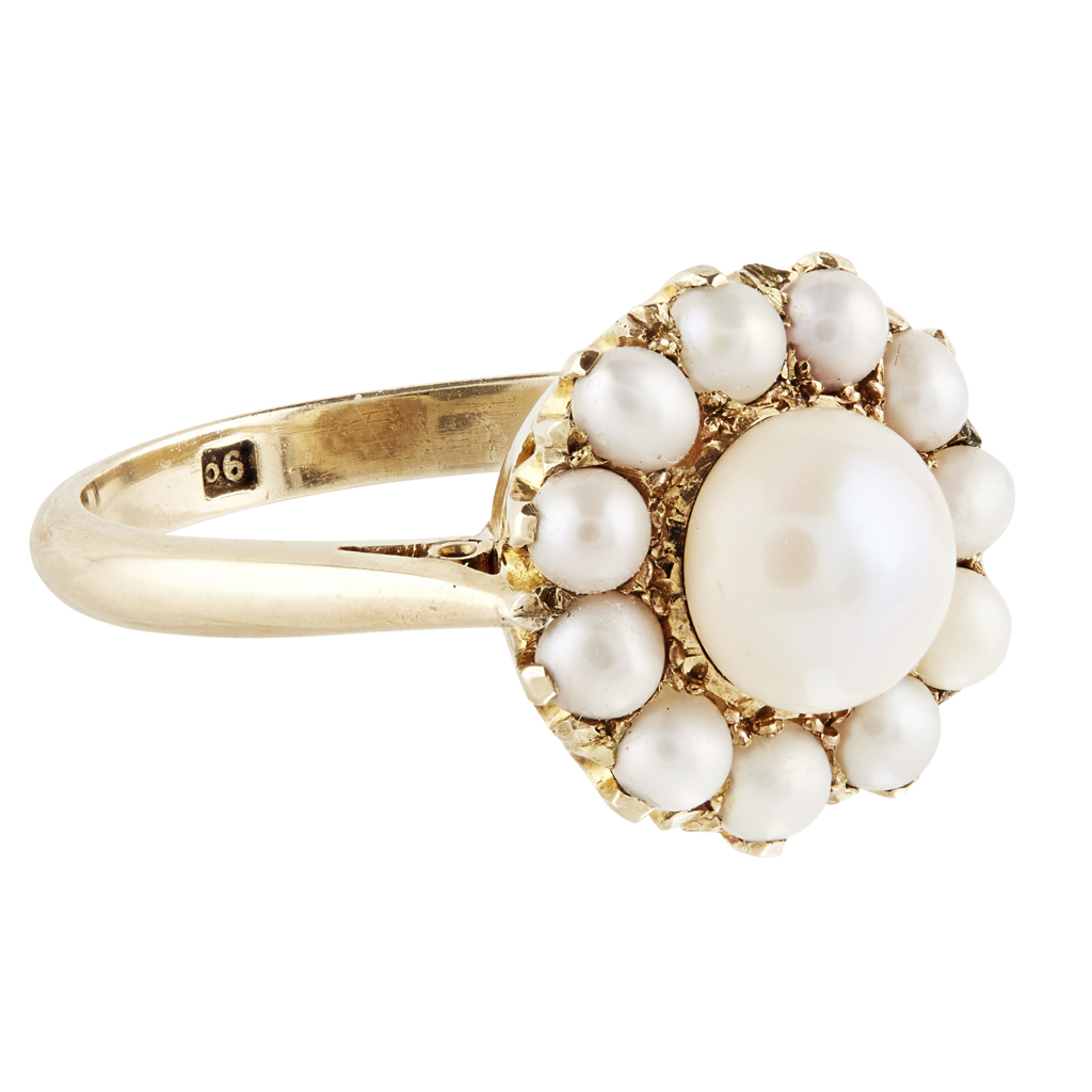 claw set with a central bouton pearl in a border of smaller pearls, to a plain shank, stamped 9c