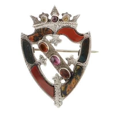 of conventional open heart form, set throughout with various agates, the intricate pierced 'crown' surmounting set with various amethyst and citrines, engraved to reverse registration marks for 1866