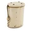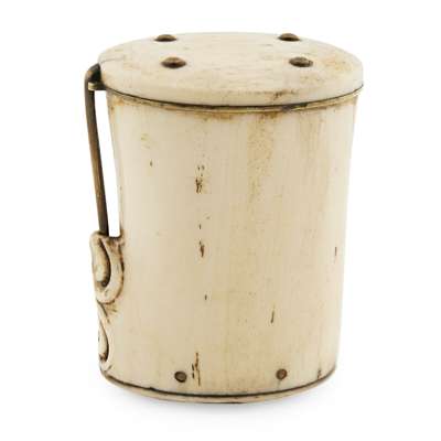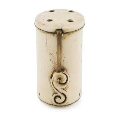 the polished bone body with carved scroll detail which acts as safety clasp, with brass mounted hinged cover