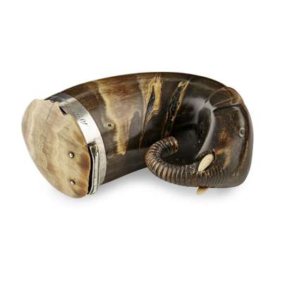 the polished cow horn body with carved elephant head terminal, with bone in set eyes and tusks, the silver collar engraved '1822 From James Watt to Robert Inglis Singer Glasgow', with hinged polished horn cover