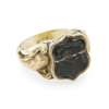 the banded agate intaglio of shield-shaped outline, engraved with displayed rose head and single bud emanating from stem with motto Turno Tempus Erit above, set in a tradition collet setting with deep scroll to the shoulders