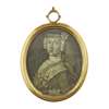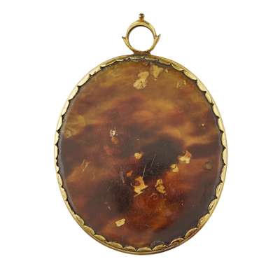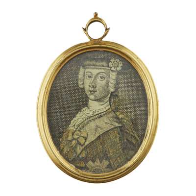 the half-length portrait after Sir Robert Strange with Prince Charles wearing blue bonnet and white cockade, in a gilt metal reeded frame with integral suspender the reverse with tortoiseshell backing