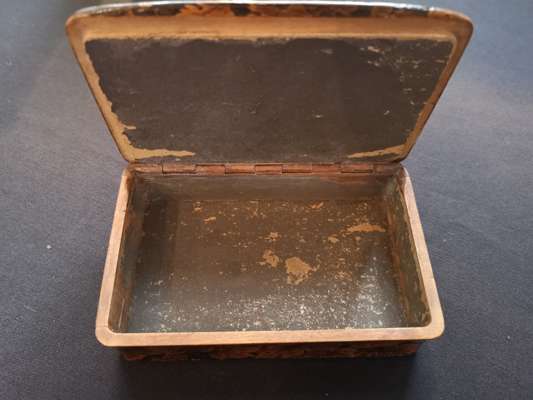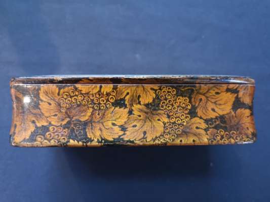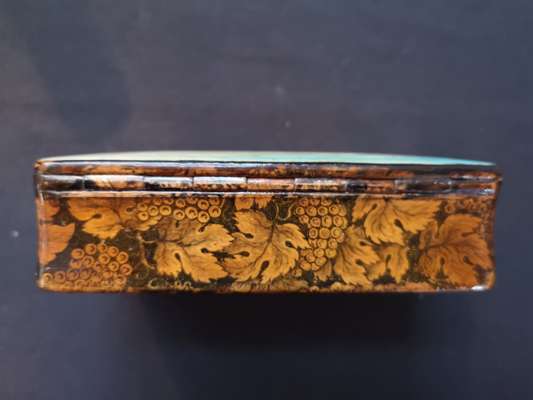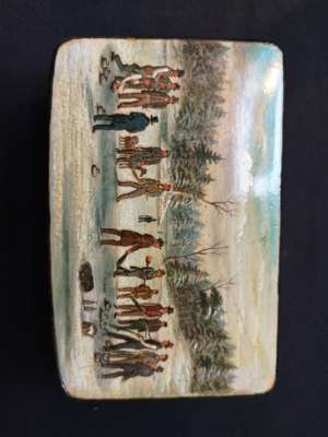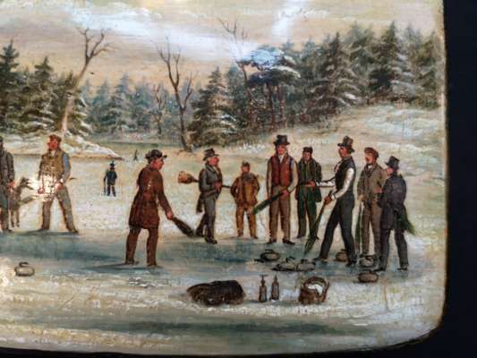 the lid with hand-painted scene of a curling match, the sides and base with penwork decoration of leaves and berries, opening to a void interior