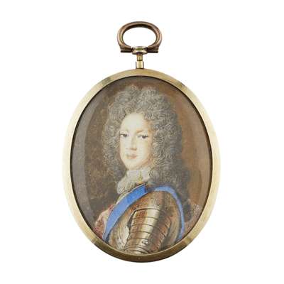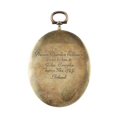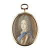 the half-length portrait of King James III in armour with blue sash and red cloak, in silver frame, the reverse engraved (later hand) Prince Charles Edward/ given by him to/ John Greyke/ before 'The 1745'/ Arlaud, contained in a fitted red leather case