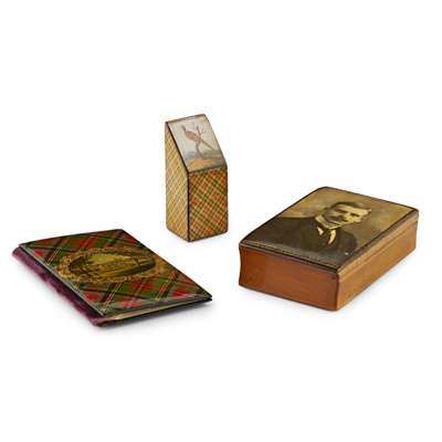 comprising a SNUFF BOX, the lid depicting a portrait of a man, interior inscribed J. CHALMERS/ AUCHINLECK, 10cm wide; a TARTANWARE NEEDLE CASE, in Bonnie Prince Charlie tartan, the cover depicting Balmoral Castle, 10cm wide; and a TARTANWARE NEEDLE HOLDER, the lid depicting a pheasant, 6cm high (3)