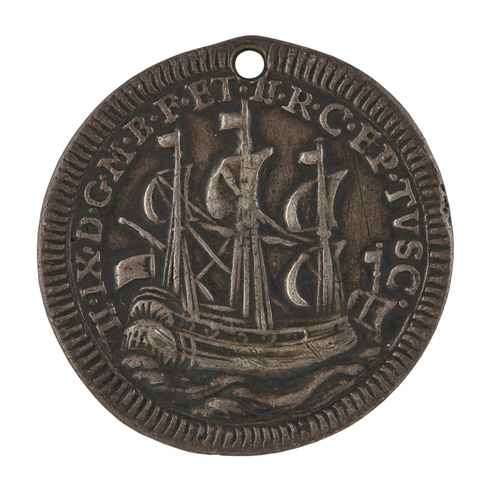 Obverse with ship in full sail and legend around, the reverse with St. Michael slaying dragon