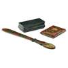 comprising a SNUFF BOX, in Montgomery tartan, 9.5cm wide; a LETTER OPENER, in Bonnie Prince Charlie tartan, the handle depicting Holyrood castle, 24cm long; and a NEEDLE CASE, in Stuart tartan, the cover depicting a scene of Loch Katrine, 8.5cm long (3)