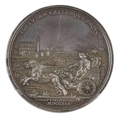 Reverse; Princess hurriedly escaping in a horse and carriage with Rome in the distance with legend FORTVNAM. CAV. SAMQVE. SEQVOR and in exergue DECEPTIS. CVSTODIBVIS. MDCCXIX