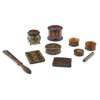 comprising a SNUFF BOX, in 'Clanronald', 7cm diam.; TWO NAPKIN RINGS, in 'Macpherson' and 'Caledonia', 5cm diam.; a SPOOL BOX, in 'Caledonia', 8cm diam.; a PIN CUSHION, in 'Stuart', 5cm diam.; a STAMP BOX, in 'McDonald', 4.5cm diam.; a NEEDLE CASE, in 'Prince Charlie', 8.5cm long; and a SNUFF BOX, 7cm wide; a PAGE TURNER, 23.5cm long; a CAULDRON, 5.5cm high; and a BEZIQUE, 9.5cm high; all in unidentified tartans (11)
