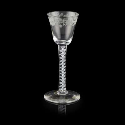the bucket bowl with engraved trailing border of flowers including a Jacobite rose, rose buds, tulip sunflower etc. with foliage between, raised on an enamel twist stem and a domed circular foot