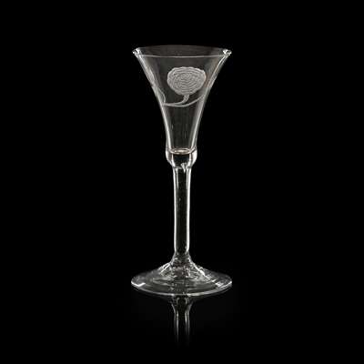 the slender trumpet bowl engraved with open rose head and empty bud, on a plain stem and conical foot