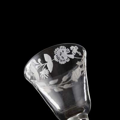 the round funnel bowl engraved with a band depicting a rose, honeysuckle and carnation, with slightly tapered stem on a conical foot