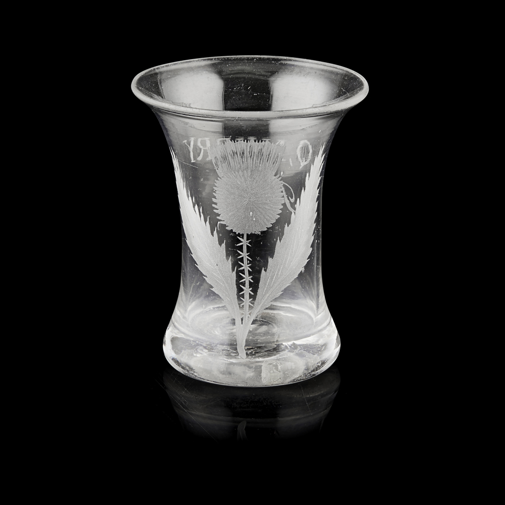 of waisted form with an everted rim, engraved with a thistle to one side, and the name Q. MURRY and REDI to the other