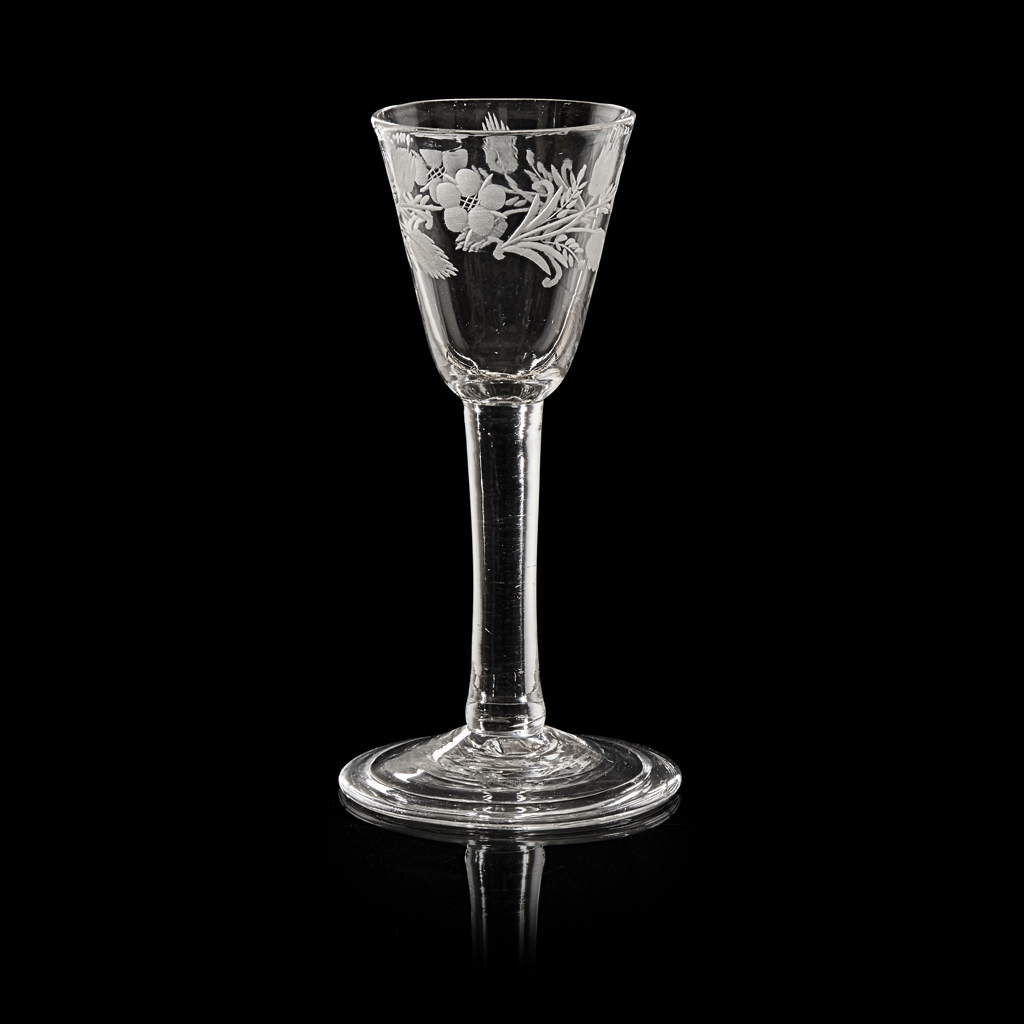 the bucket bowl with engraved trailing border of rose heads and foliage, on a straight plain stem and domed foot with folded rim, with label for the James Hall Collection