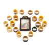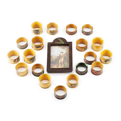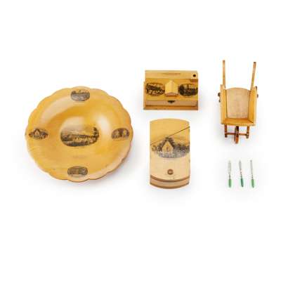comprising a LARGE TULIP-SHAPED VASE, 28cm high; TWO SMALL TULIP SHAPED VASES,18cm high; TWO CYLINDER VASES, 11cm high; a PAIR OF CYLINDER VASES, 9cm high; a TRINKET BOX, in the form of a cottage 11.5cm wide; a PUZZLE BOX, 14cm long; a LOW LOBED DISH, 23cm diameter; a MODEL WHEELBARROW, 18cm long; EIGHT TARTANWARE NAPKIN RINGS, in 'McFarlane, 'Stuart', 'Prince Charlie', 'McLean' tartans, 5cm diameter; ELEVEN MAUCHLINE WARE NAPKIN RINGS, 5cm diameter; a PICTURE FRAME, mounted with a cold painted metal sprig of heather, 18.7cm x 11cm; together with a SCALLOPED FERN DISH, 23cm diameter (qty)