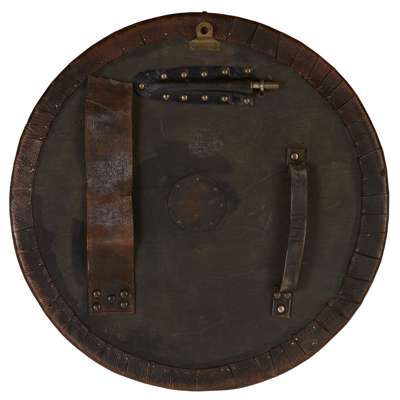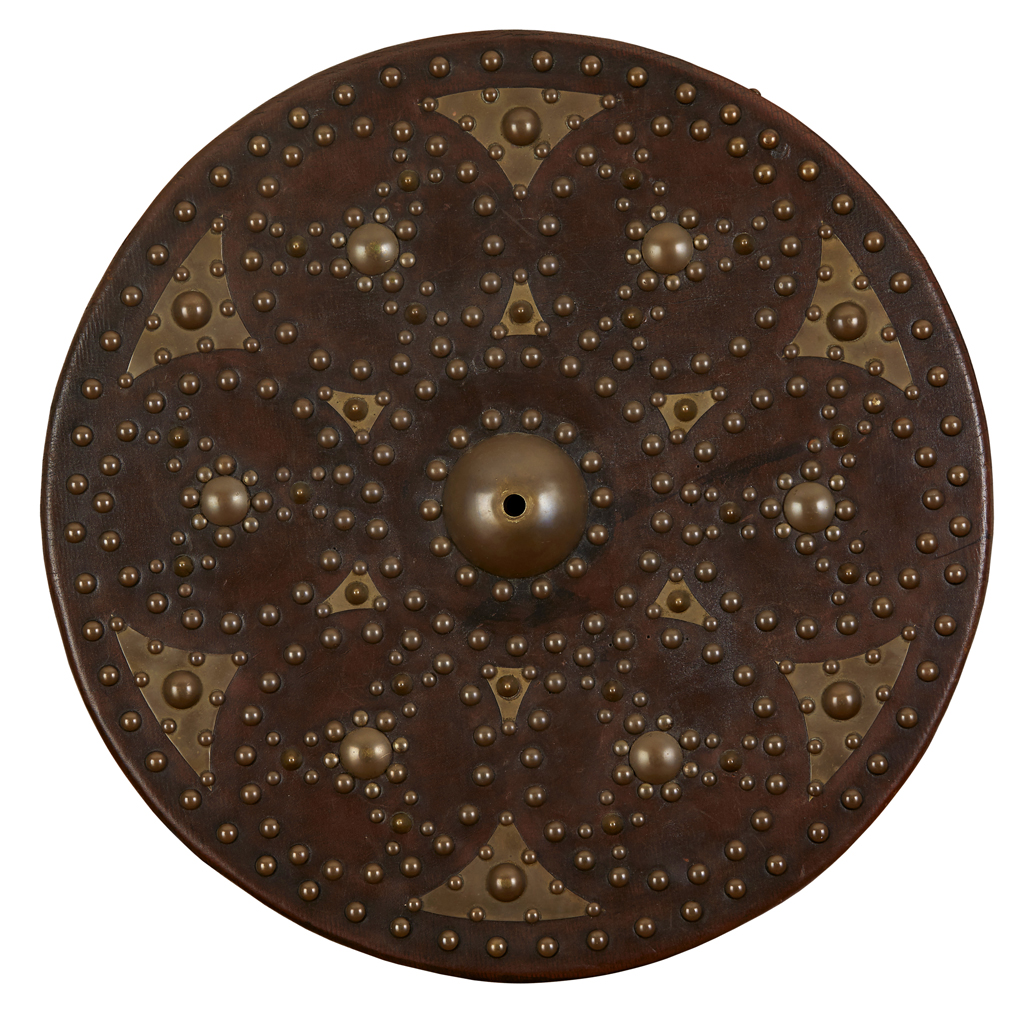A LEATHER AND BRASS STUDDED REPRODUCTION TARGE