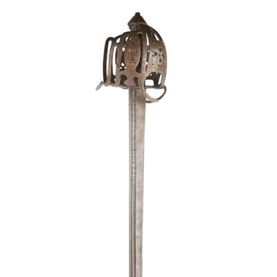 the basket formed of flattened side and main guards with pierced heart shaped dot decoration, wooden grip and conical pommel, with single edged double fullered blade signed four times X ANDRIA X FARARA X