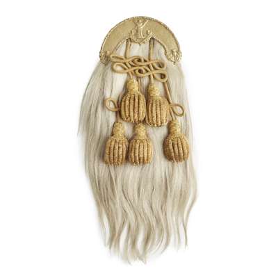 the arched gilt brass cantle with cast thistle border and central regimental badge, the white goat hair body with five knotted gold bullion tassels, the reverse with red morocco leather pouch