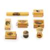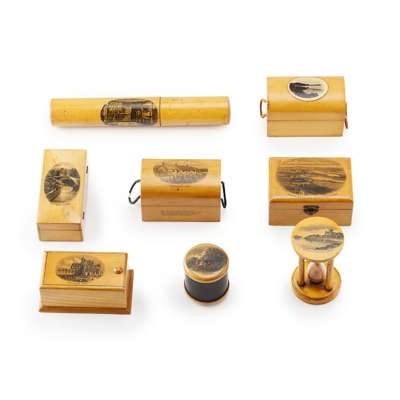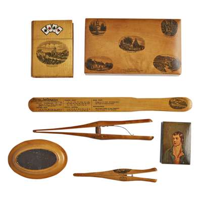 comprising a GROUP OF MINIATURE CAULDRONS AND COVERS, the largest with a printed image of Ballochmyle Bridge and a verse, 8cm high; a WALL MOUNTED MATCH HOLDER, 17cm high; a FOOTED SALT, 4cm high; and a SPOOL BOX, 6cm high; GLOVE STRETCHER, with transfer print, 25cm; a RECTANGULAR CARD BOX, 20.5cm long; another RECTANGULAR BOX, with portrait of Robert Burns on the lid, 9cm long; a GLOVE STRETCHER, 8cm long; a BOOK SHAPED BOX 12cm long; a PIN PLATE, 13cm long; a PAGE TURNER, featuring the name of W&A Smith Woodware, 35cm long; an EGG TIMER, bearing a mark from G.A. MacLeod in Oban, 8.5cm; a BOX 19.5cm long; a THIMBLE BOX, 5cm tall; a BOX, 8.5cm; a BOX, 10cm long; another BOX, 8.5cm long; a BOX with a transfer of Melrose Abbey on a sliding lid, 9.5cm; a box with a transfer of the Burns' Cottage, 8.5cm long (qty)