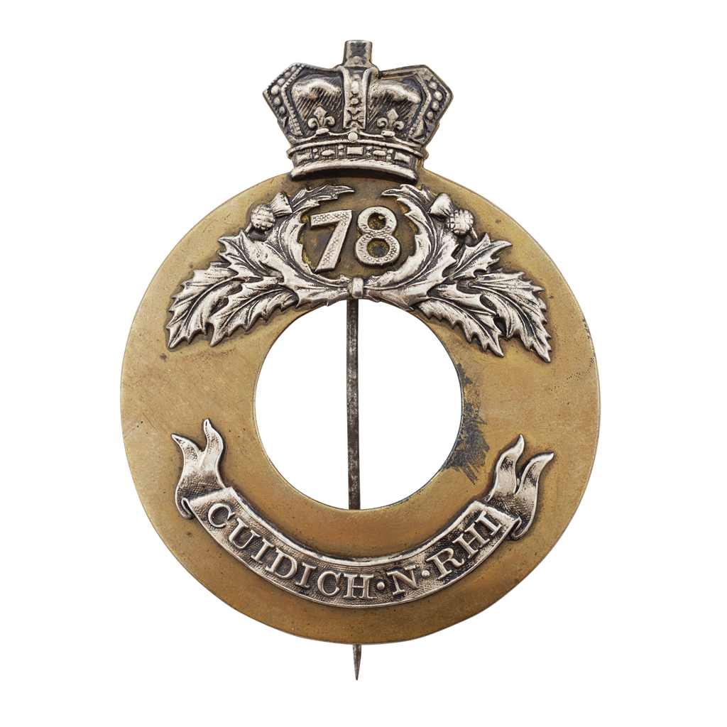 A MID-VICTORIAN 78TH HIGHLANDERS (DUKE OF ALBANY'S / SEAFORTH HIGHLANDERS) BRASS AND SILVER PLAID BROOCH