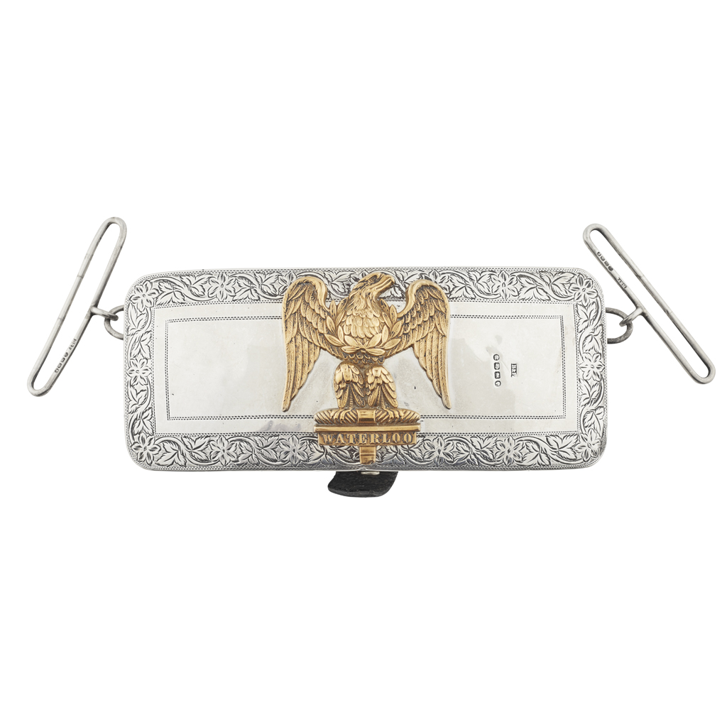 the curved leather covered cartridge case with hinged silver cover with foliate engraved border and applied gilt regimental badge, with silver mounts