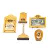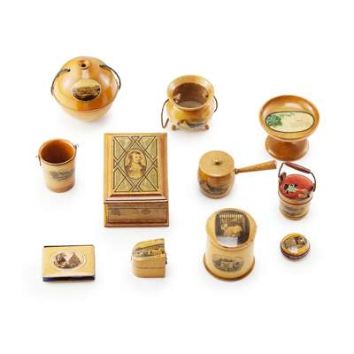 comprising a CAULDRON, 6.5cm diameter; a PIN CUSHION in the form of a bucket, 5cm high; a THIMBLE HOLDER, in the form of a cooking pot, 9.5cm across (including handle); a RING BOX, 4cm long; a SMALL BOX, in the form of a bucket, 5cm tall; a CYLINDRICAL BOX, 7cm tall; a 'PATTERNWARE RECTANGULAR BOX', 11.5cm long; a NEEDLE HOLDER, in the shape of a book, 6cm long; a PIN CUSHION, 3.5cm diameter; a COTTON THREAD HOLDER, 8cm in diameter; a PIN DISH, 8cm; a FOLDING LETTER RACK, 19.5cm high; a THERMOMETER, 17cm high; an INKWELL, in the form of a horseshoe and jockey's cap, 10.5cm long; a PICTURE FRAME, 16cm wide; a CARD HOLDER, 12.7cm high; a WATCH HOLDER, 11.5cm high; together with a STATIONERY RACK, with three shelves and a stamp drawer, 12cm high (qty)