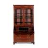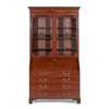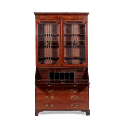 the straight moulded cornice above a pair of astragal glazed doors enclosing adjustable shelves and centred by gilded verre églomisé thistle panels, the slant front opening to an interior with pigeon holes and drawers over four long graduated drawers, on bracket feet