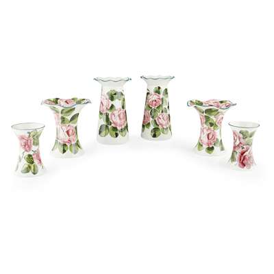 comprising A PAIR OF GROSVENOR VASES, 20cm high; a PAIR OF LADY EVA VASES, 15.5cm high; and a PAIR OF SMALL BEAKER VASES, 11cm high, variously marked, minor restoration (6)