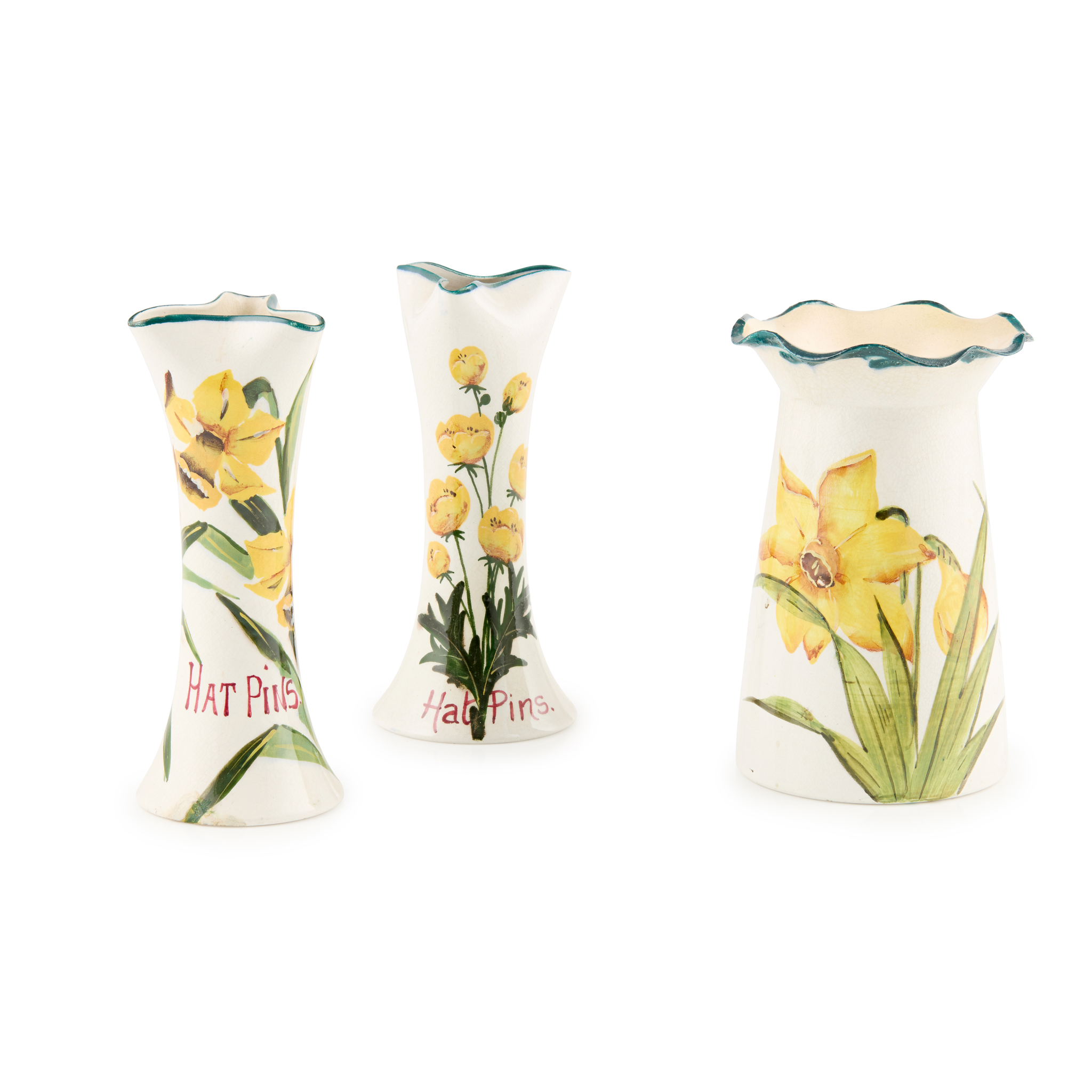 glazed earthenware, each with red painted inscription ‘HAT PINS’, one painted with ‘BUTTERCUPS’, impressed and painted maker's mark WEMYSS, paper exhibition label for Christie's Glasgow, 1990; the other painted with ‘NARCISSI’, impressed maker's mark WEMYSS, 14.7cm and 15.2cm high, together with a GROSVENOR VASE painted with ‘NARCISSI’, impressed maker's mark WEMYSS, printed Thomas Goode & Co. retailer's mark, 14.1cm high (3)