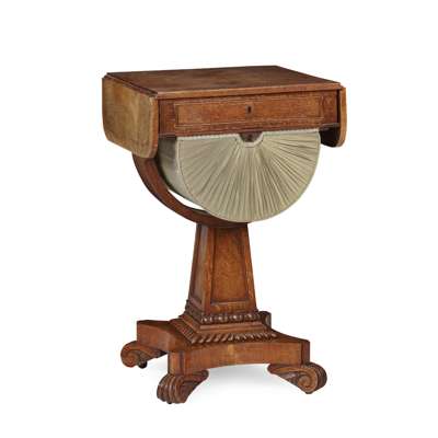 the rectangular top with two rounded drop flaps, fitted drawer and sliding pleated pastel silk demi-lune basket below, all on a curved support on a tapering panelled square column and a concave quadripartite base with gadroon detail and scroll feet on brass casters