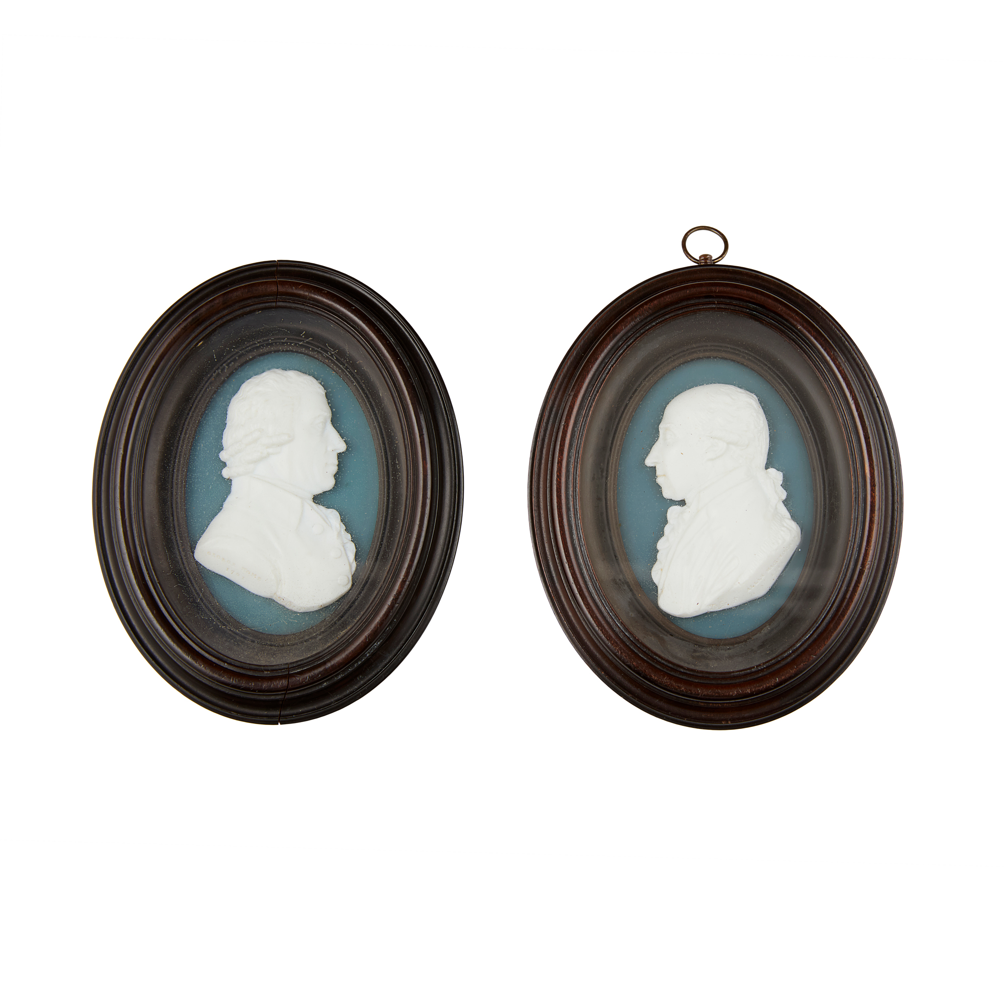 depicting George Home and Allan Maconochie, each stamped with name, dated 1791 and ‘Tassie F’, each in a stained wood glazed oval frame mounted on a blue reverse painted glass backing, each 15cm high, 12cm wide; together with a CREAM WAX RELIEF PORTRAIT OF A GENTLEMAN, 19TH CENTURY, mounted in a circular ebonised glazed frame, 20cm diameter (3)