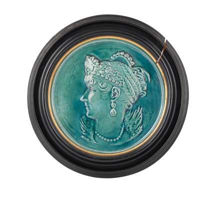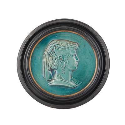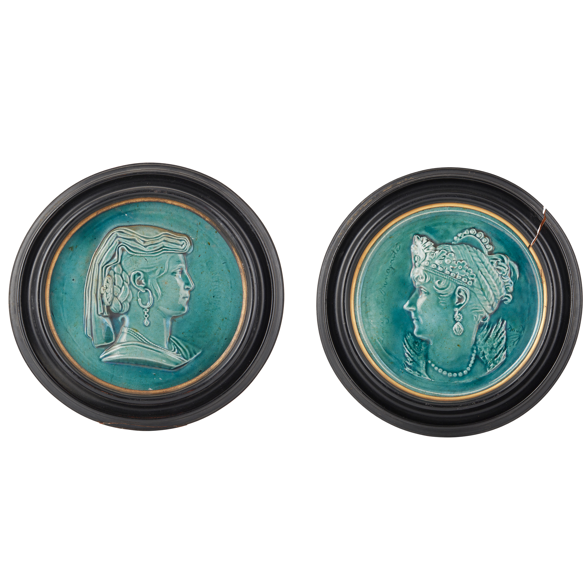 the turquoise-glazed plaques modelled in relief with female portraits, titled ‘Contadina’ and Josephine Bonaparte, First wife of Napoleon I, after a medallion by Pierre Jean David d'Angers, mounted inside ebonised and gilt round moulded frames