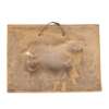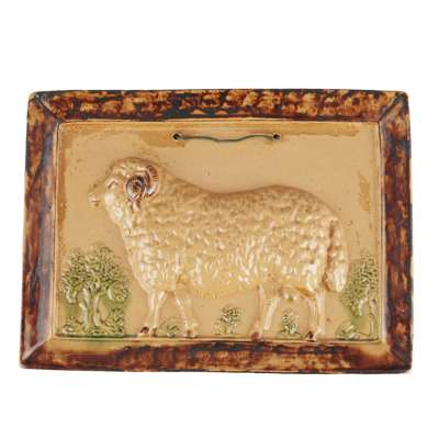 moulded with a ram, with moulded green glazed tree and foliate details, within a moulded rectangular frame with brown mottled glaze