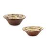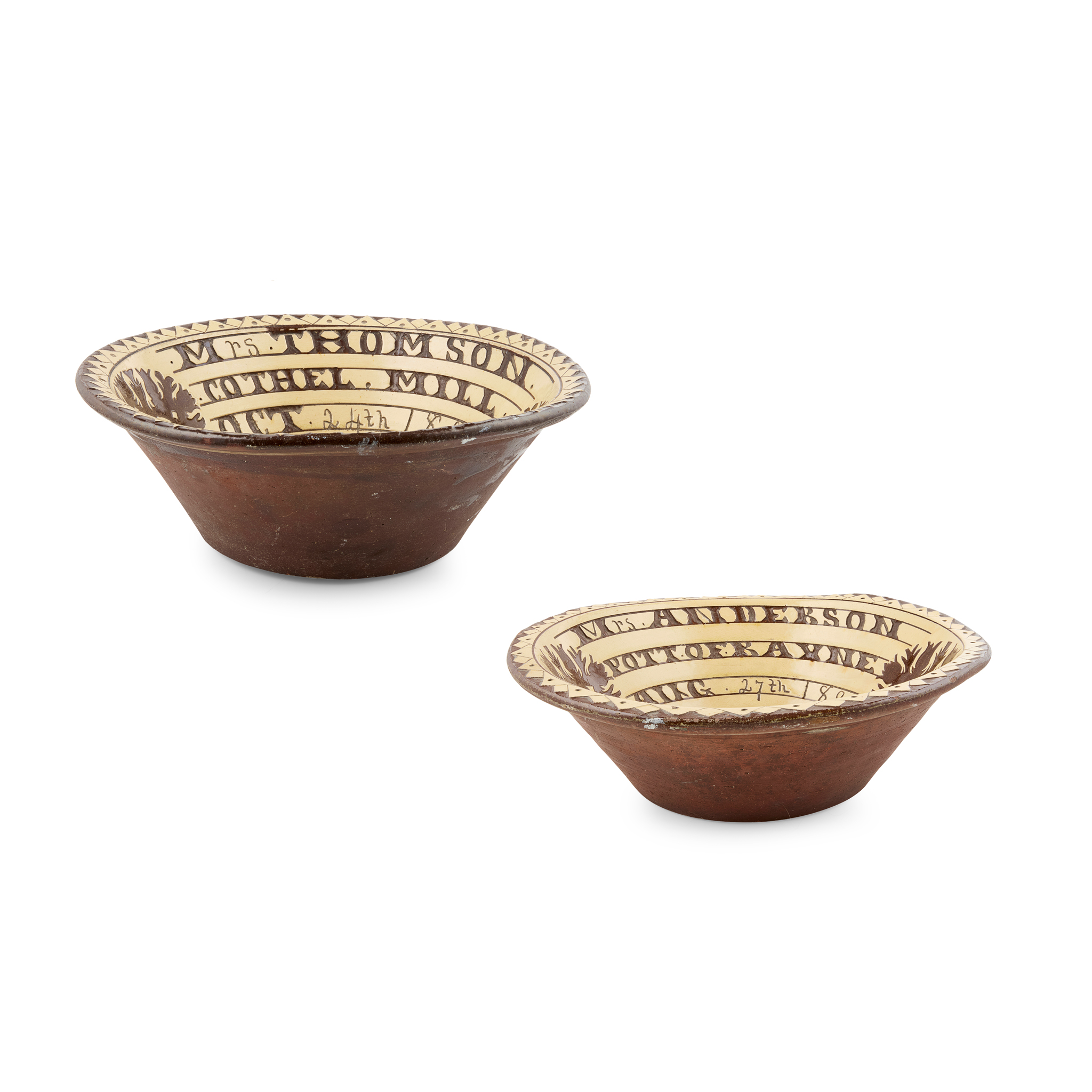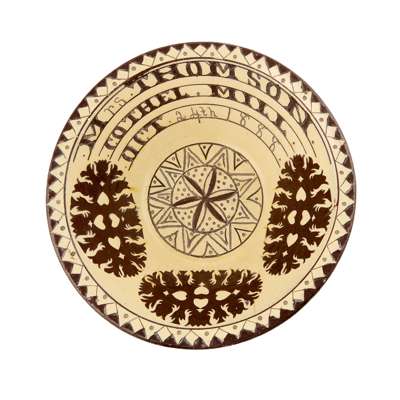 each centered with a stylised flower head motif and with slip cut stylised designs throughout, one inscribed and dated ‘Mrs Thomson, Cothel Mill, Oct 24th 1888’, 37.5cm diameter, the other inscribed 'Mrs Anderson, Pott of Ravne, Aug 27th 1894,