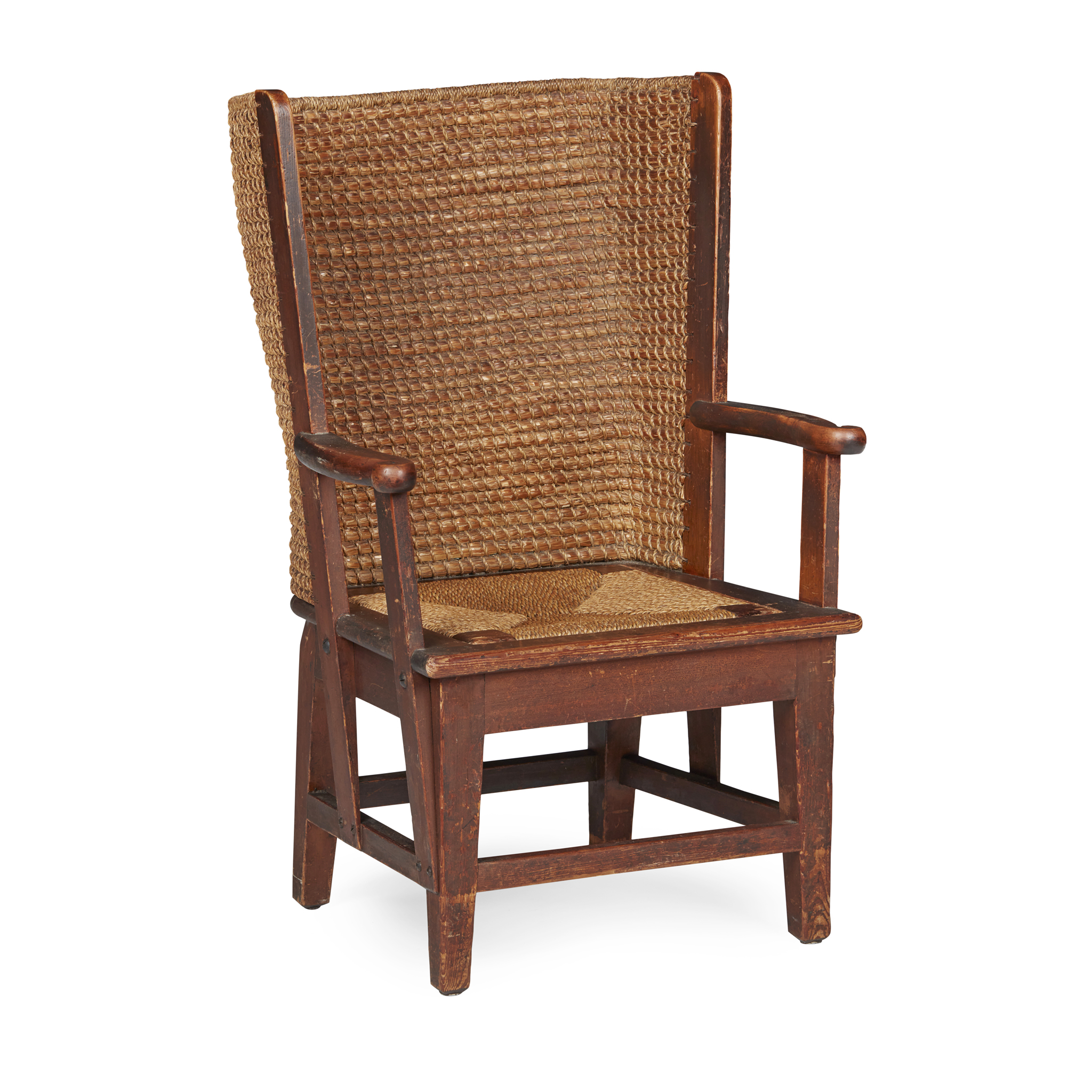 with curved beech arms with scrolled terminals, with a lift out woven rush seat raised on square tapered legs joined by stretchers