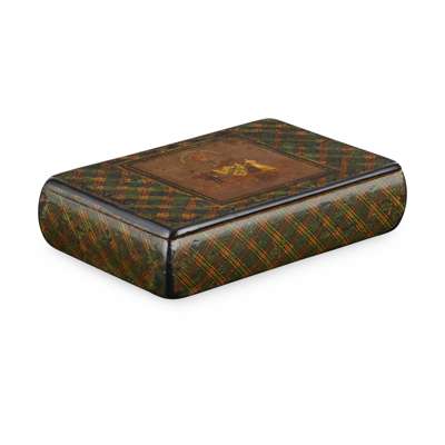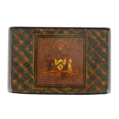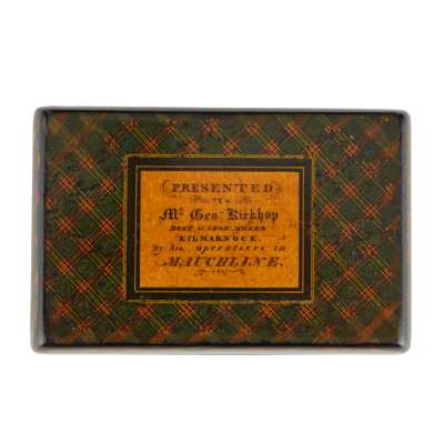 the lid with the boot and shoe maker's crest to the front and motto, the base with plaque ‘ Presented to Mr Geo Kirkhop, Boot & Shoe maker, Kilmarnock, by his operatives in Mauchline 1837’, remanence of foil lining