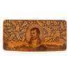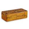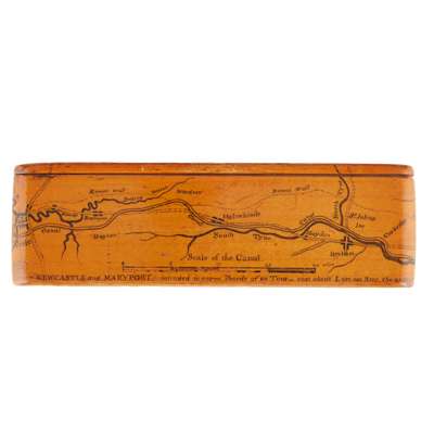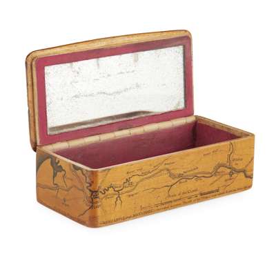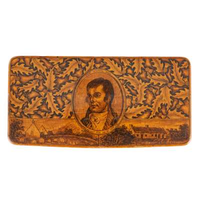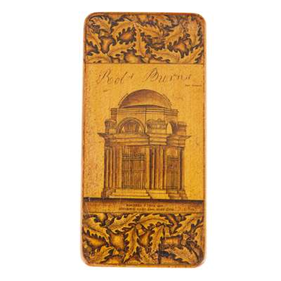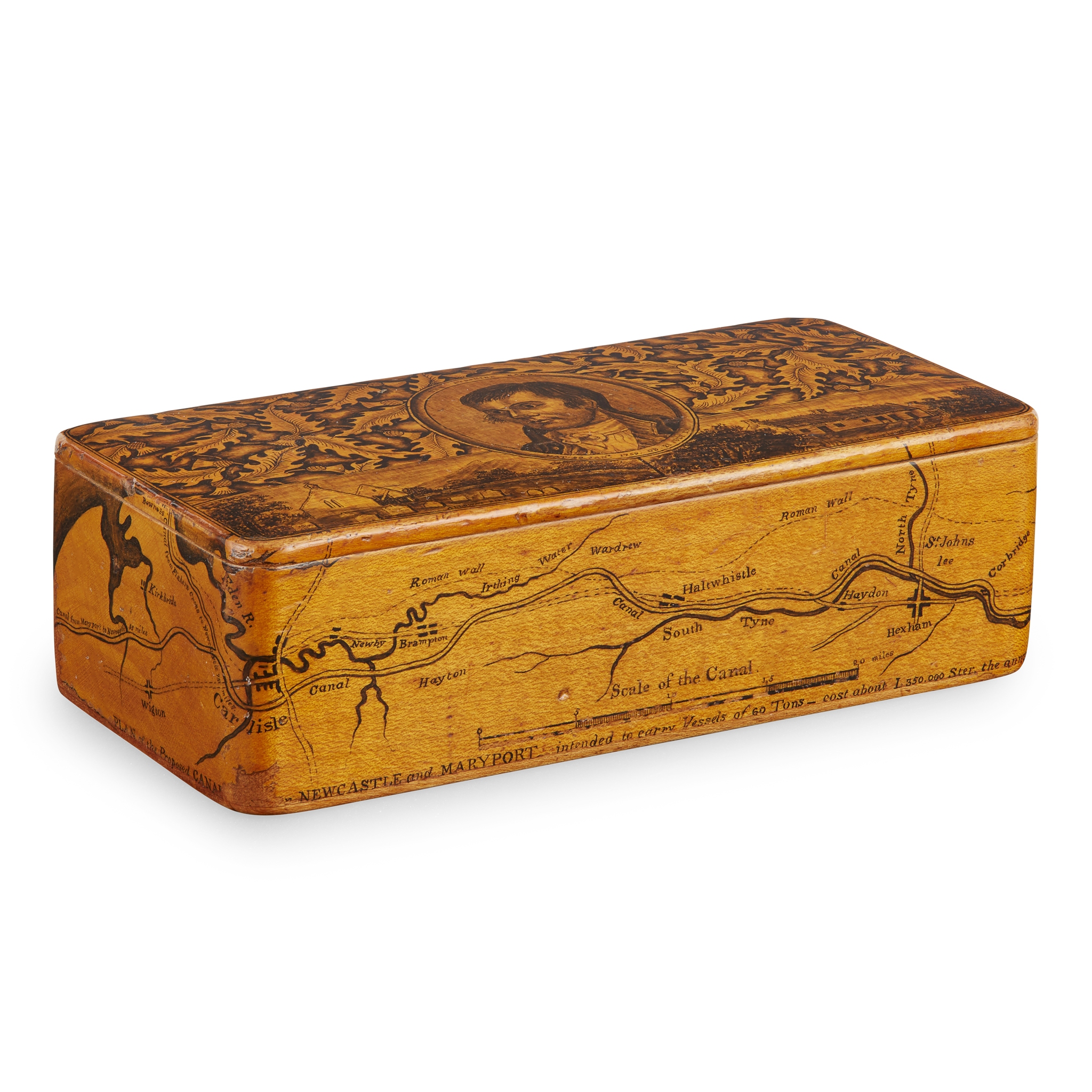 the lid, sides and base showing pen and ink work panels relating to Robert Burns and also the proposed canal stretching from Newcastle to Carlisle, signed below the panel of the Burns Mausoleum to the base, the interior lined in pink silk on card with a small mirror mounted to the lid