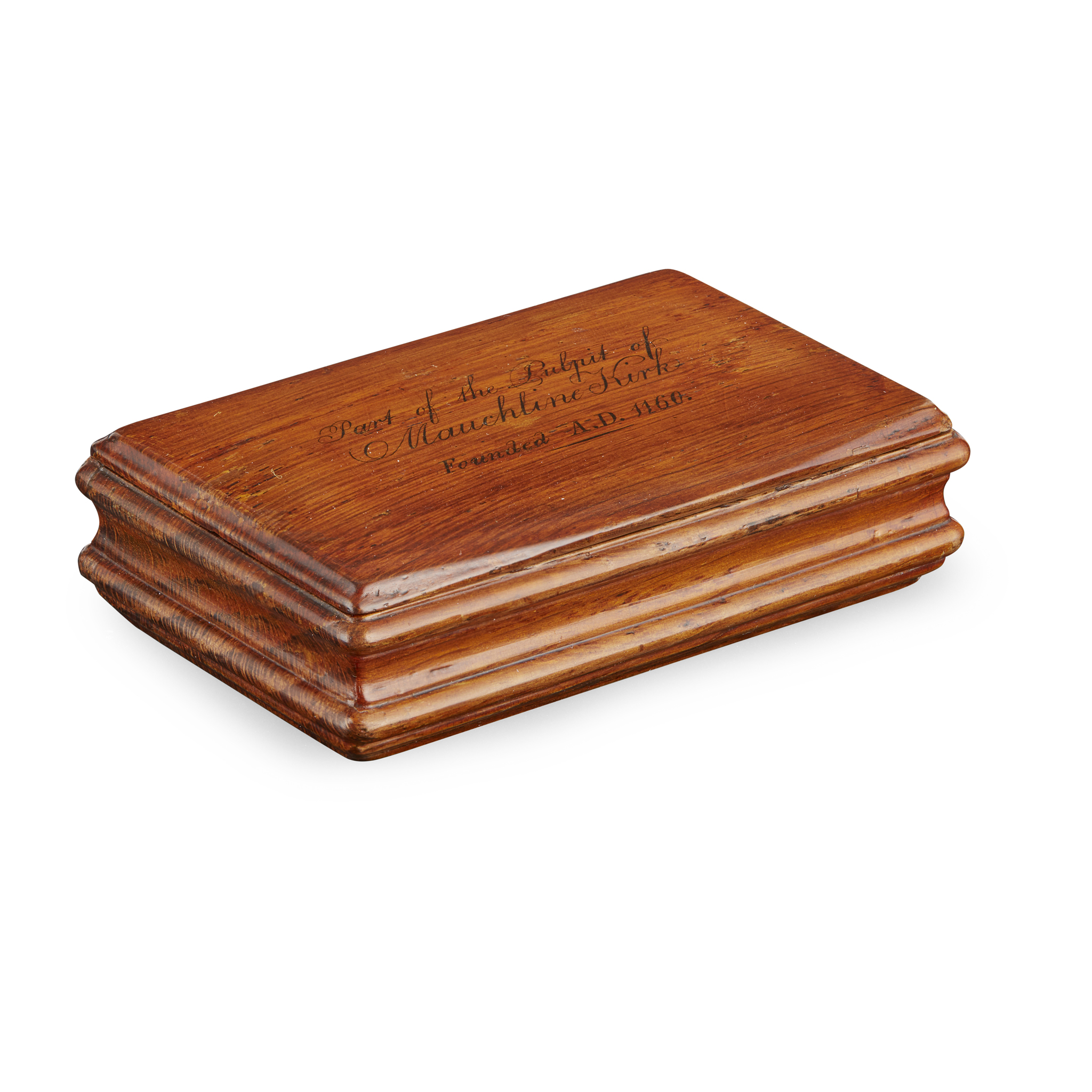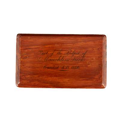 the lid with penwork inscription ‘Part of the Pulpit of Mauchline Kirk, founded AD 1160’, remanence of foil lining