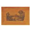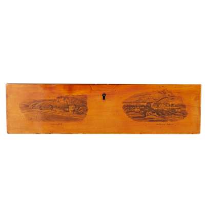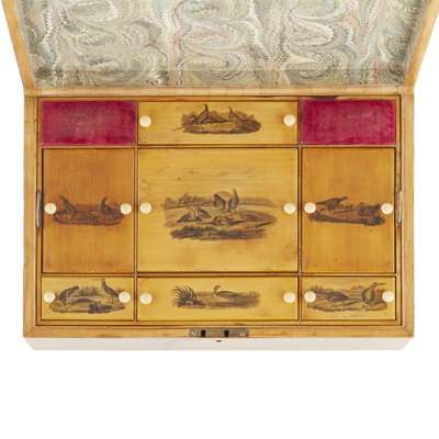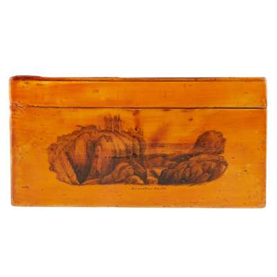 a very faint ink inscription to the right of the lock, the top and sides with penwork scenes including Loch Ard, Abbotsford, Holyrood Palace, Dunstafnage, Dunnottar, Craigcreek and Bothwell Castles, the fitted interior with a lift out compartmentalised tray, the lids decorated with wildfowl