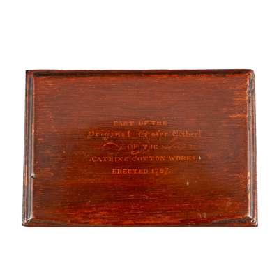 the lid with inscription ‘Part of the original water wheel of the Catrine cotton works, Erected 1787’, on the reserve the inside the lid of the card case section is a poem about the wheel, reputedly written by the then accountant of the works