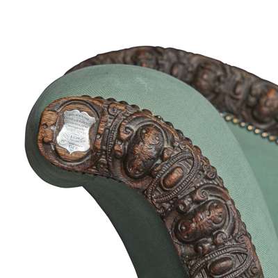 one curved arm with a sloping partial back, the frame carved in earlier oak with rich egg and dart borders, upholstered in teal upholstery, on bobbin turned legs with brass castors, the end of the arm set with a silver plaque ‘Oak from the house in Edinburgh erected 1490, occupied by John Knox from 1559 till his death 24th November 1572’