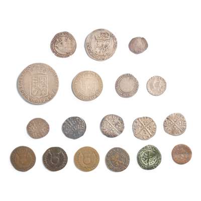 To include a William & Mary 1689 halfcrown, William & Mary Scottish 1692 ten shilling, a small group of James VI, Charles I hammered silver coins, and various base metal issues; together with four Edward I pennies and halfpenny from the Berwick mint (qty)
