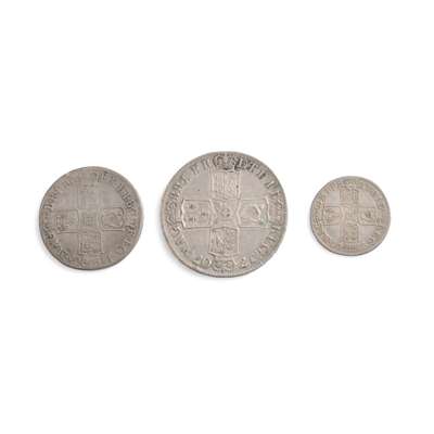 With E below bust, edge SEXTO, VF; together with a 1708 Edinburgh mint halfcrown F S.5710a and a 1707 Edinburgh mint shilling F S.5712 (3)