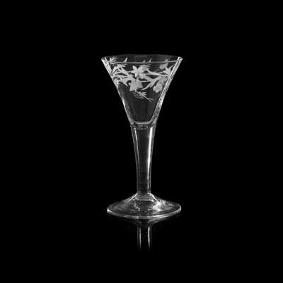 the flared funnel bowl engraved with a band of flowers including a closed bud and two insects, over a plain stem, on a round conical foot